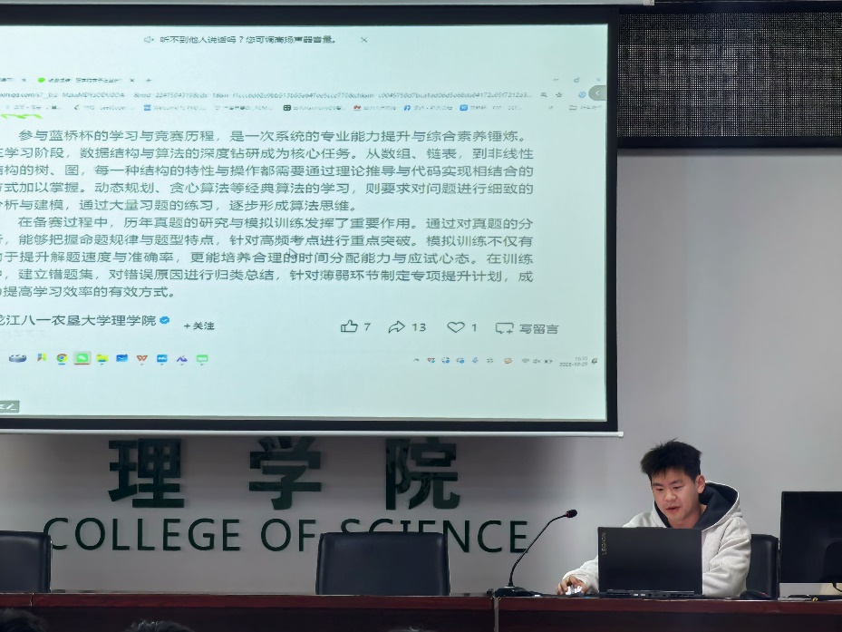 会上,赵国玉老师结合自身丰富的行业经验与竞赛指导经历,围绕蓝桥杯大赛的核心价值展开深入动员。赵老师针对大赛重点考察的算法模块进行了系统梳理,让同学们对竞赛考点有了明确认知。随后,信计专业 2023 级员工王安利结合自身从零基础入门到成功参赛的经历,分享了高效刷题的方法、遇到瓶颈时的调整策略以及参赛过程中的注意事项。会后,同学们纷纷表示,此次动员会内容丰富、实用性强,收益颇多,掀起了备战蓝桥杯大赛的热潮。